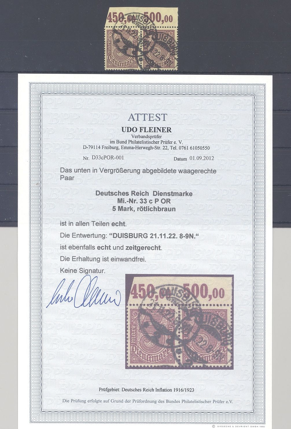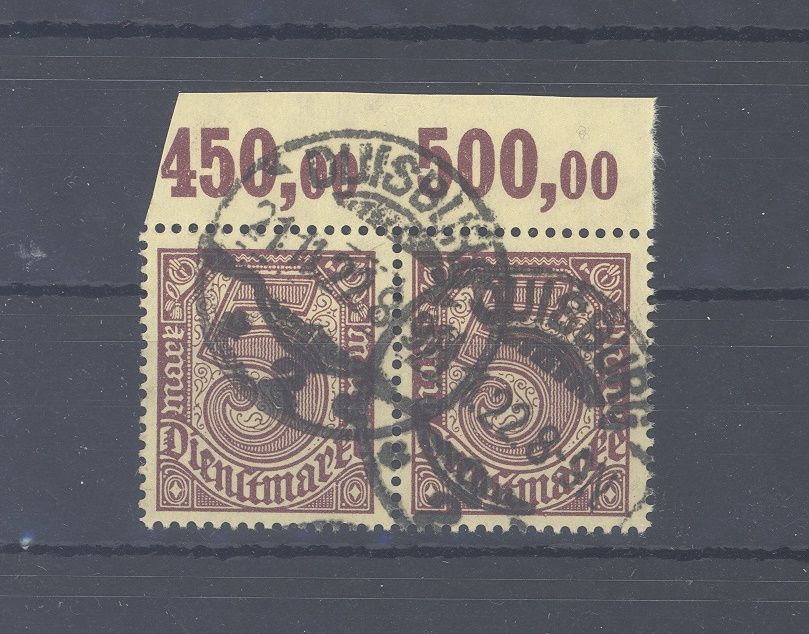 Deutsches Reich Dienst Michel Nummer 33 c P OR, 50 Pfg. Freimarke 1920 als gestempeltes Paar vom Oberrand, ein schönes Paar. Es liegt ein FA BPP vor, ist mit eingescannt, hat bereits einiges gekostet.