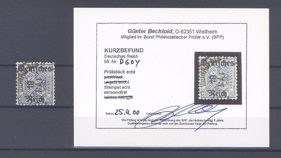 Deutsches Reich Dienst Mi.Nr. 60y, 20 Pfg. Dienst 1920 in der guten Variante y gestempelt, ein schöner Wert. Es liegt ein Befund BPP vor, ist mit eingescannt, hat bereits einiges gekostet.