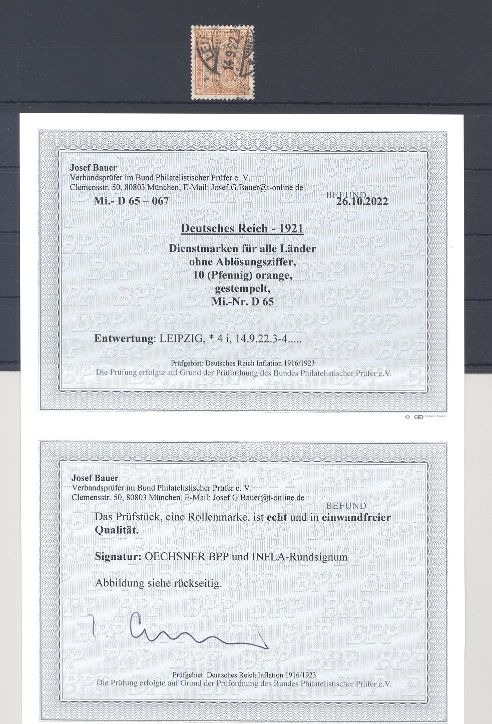 Deutsches Reich Dienst Michel Nummer 65, 10 Pfg. aus Freimarken 1921/22 gestempelt, ein ordentlicher Wert. Es liegt ein FA BPP vor, ist mit eingescannt, hat bereits einiges gekostet.