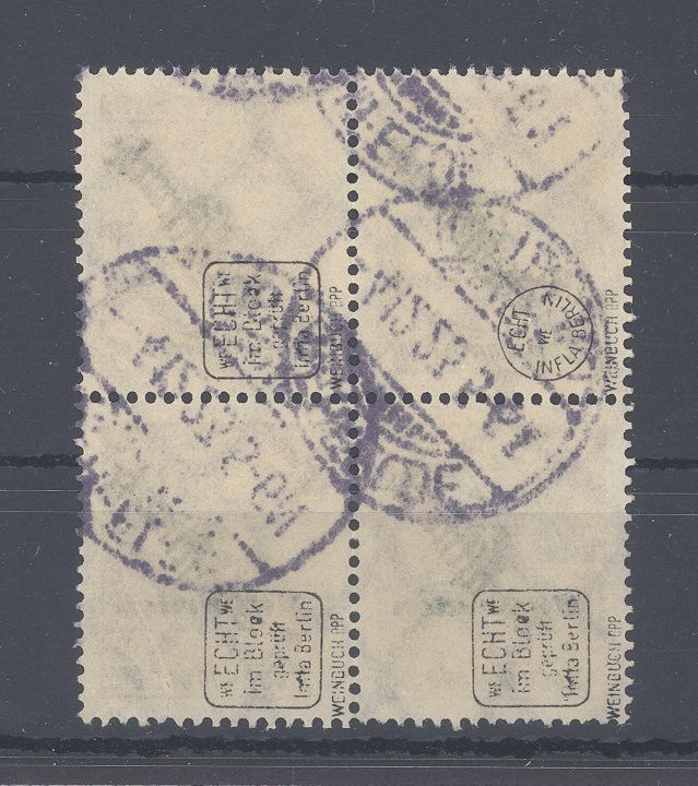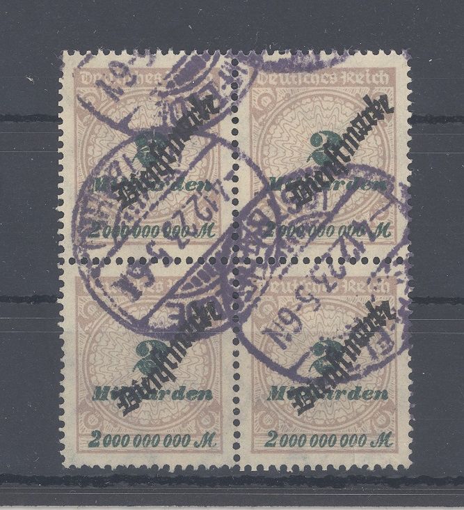 Deutsches Reich Michel Nummer 84, 2 Mrd. Freimarke 1923 als gestempelter Viererblock. Jeder Wert ist geprüft Infla und BPP.