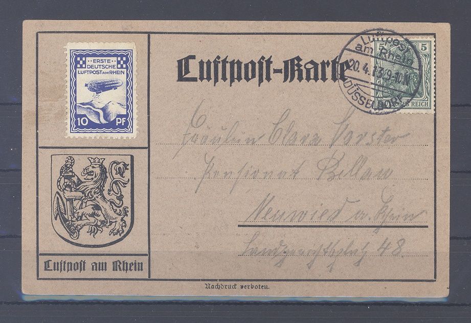 Deutsche Flugpost Flugpost Michel Nummer 9a, 10 Pfg. Flugtage Düsseldorf 1913 auf Karte. Nette Ergänzung zur Sammlung.
