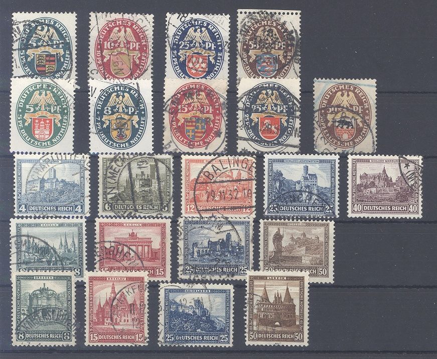 Deutsches Reich, vier verschiedene Nothilfesätze in unterschiedlicher Erhaltung aus den Jahren 1924/32 bestehend aus Michel Nummer 398/401, 425/29, 450/53, 459/62, 474/78 gestempelt als Posten. Billigst!