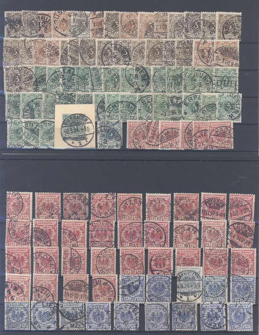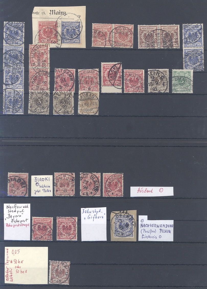 Deutsches Reich, gestempelter Posten aus Michel Nummer 42/50, Freimarken 1889 auf fünf Steckkarten, einfach zusammengesteckt, die Zettel des Sammlers sind dabei belassen. Vollkommen unberechnet, sollte eine nette Fundgrube sein...