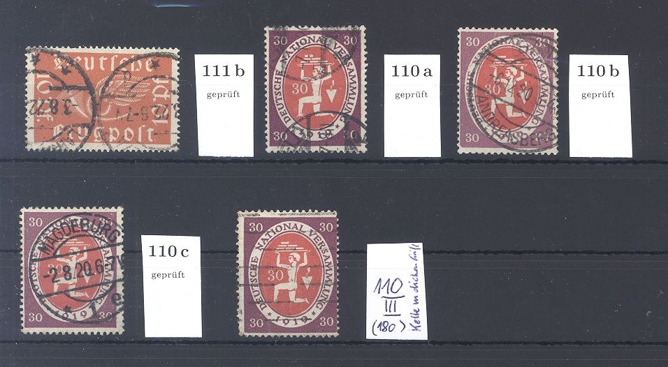 Deutsches Reich, kleiner gestempelter Posten aus Michel Nr. 110/11, Freimarken 1919 bestehend aus vier geprüften Werten und der Michel Nummer 110 III.
