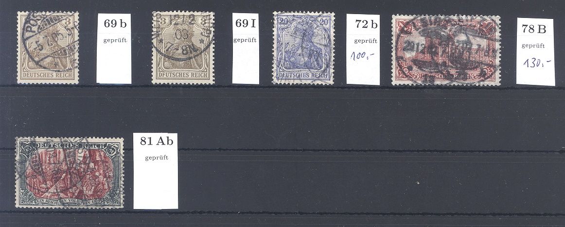 Deutsches Reich, kleiner gestempelter Posten aus Michel Nummer 68/81, Germania 1902, dabei auch Michel Nummer 78 B. Jeder Wert ist geprüft BPP