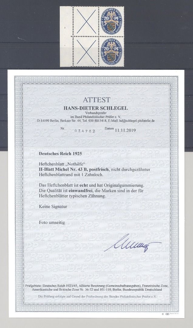 Deutsches Reich Heftchenblatt Michel Nummer 43 B, Nothilfe 1925 **, ein sehr ordentliches Heftchenblatt. Es liegt ein FA BPP vor, hat bereits einiges gekostet, ist mit eingescannt.