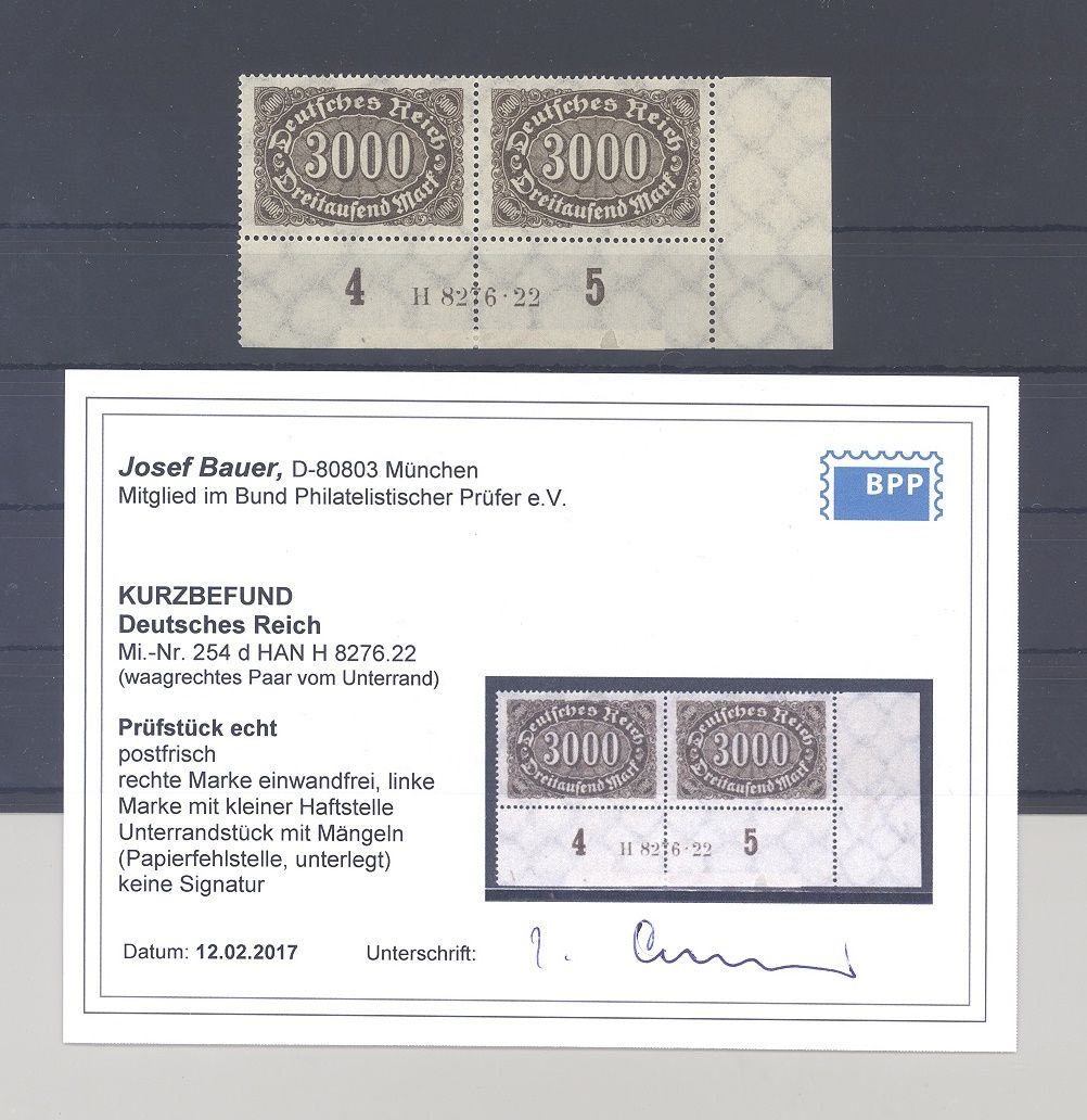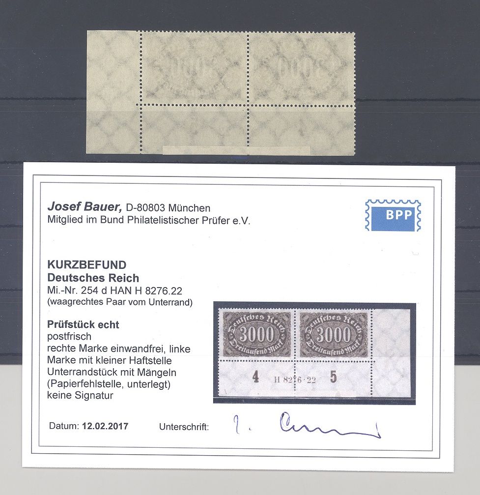 Deutsches Reich Michel 254d, 5000 Mark Freimarke 1922/23 in der Farbe d als ** HAN Paar mit Hinterlegung am Unterrand, keine Marke betroffen. Es liegt ein Befund BPP vor, ist mit eingescannt, hat bereits einiges gekostet, die beiden losen Einzelmarken werten bereits mit 440,00, schöne Ergänzung zur Sammlung!