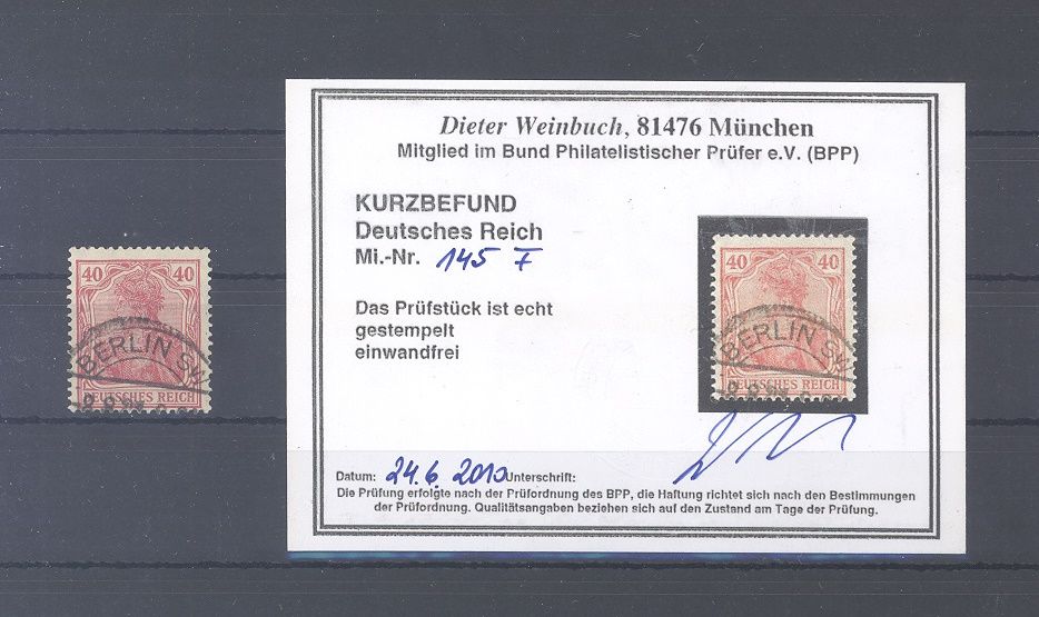 Deutsches Reich Michel Nummer 145 F, die Michel Nummer 145 in der guten Variante F gestempelt, ist jetzt die Michel Nummer 145 b II, ein sehr ordentlicher Wert. Es liegt ein Befund BPP vor, hat bereits einiges gekostet, ist mit eingescannt.