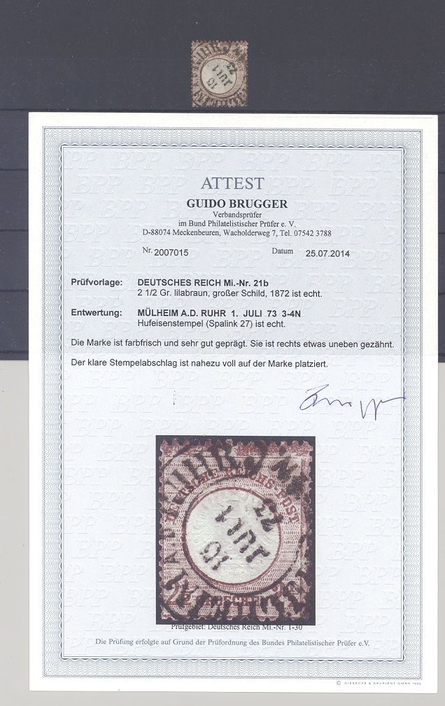 Deutsches Reich Michel Nummer 21b, 2 1/2 Groschen großes Brustschild in der guten Farbe b gestempelt mit ausgesprochen schönem Stempel. Es liegt ein Befund BPP vor, hat bereits einiges gekostet, ist mit eingescant.