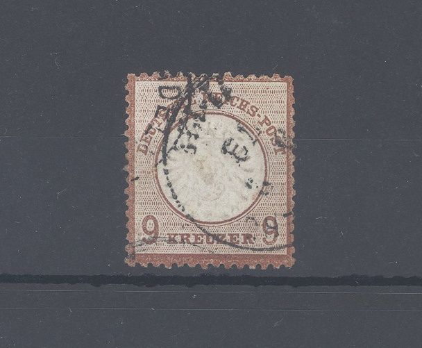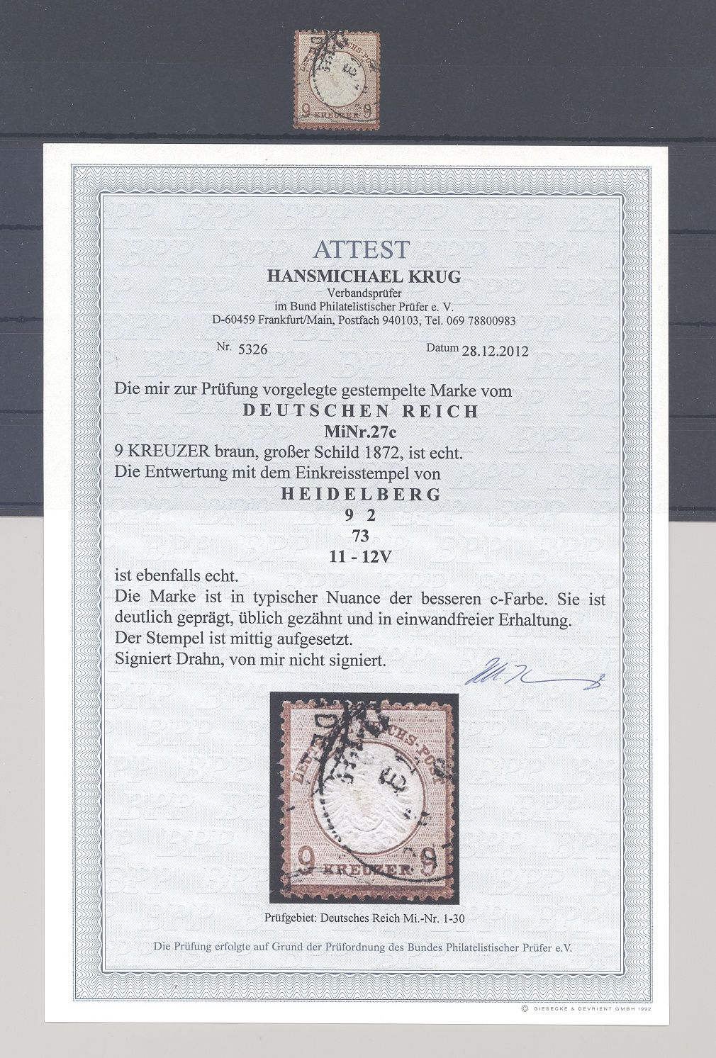 Deutsches Reich Michel Nummer 27c, 9 Kreuzer großes Brustschild in der guten Farbe c gestempelt, ein ordentlicher Wert mit deutlicher Prägung. Es liegt ein FA BPP vor, hat bereits einiges gekostet, selten einmal angeboten.
