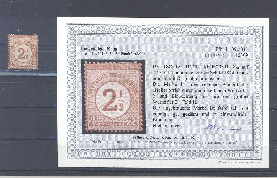 Deutsches Reich Michel Nummer 29 VII, die 2 1/2 Gr. Freimarken 1874 mit dem wie auch im Befund angegeben seltenen Plattenfehler IVII ungebraucht *, ein ordentlicher Wert. Es liegt ein Befund BPP vor, ist mit eingescannt, hat bereits einiges gekostet, der Michel passt hier wohl nicht.