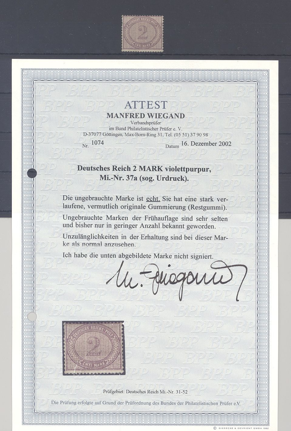 Deutsches Reich Michel Nummer 37a, 2 M Freimarke 1875 in der sehr seltenen Farbe ungebraucht mit Restgummi, der Michel für ungebraucht (*) beträgt 750,00 Euro und für ungebraucht * 2.500,00 Euro. Es liegt ein FA BPP vor, hat bereits einiges gekostet, ist mit eingescannt.