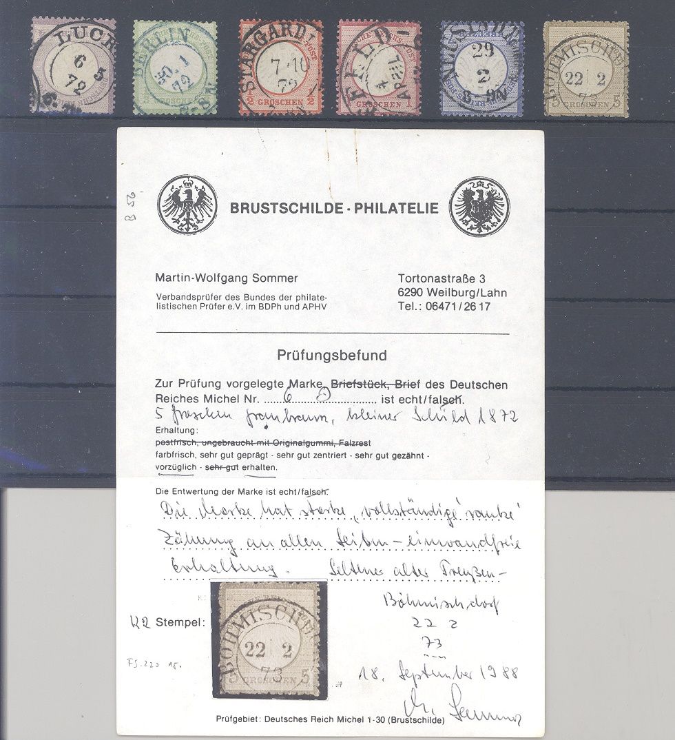 Deutsches Reich Michel Nummer 1/6, die Groschen Ausgaben kleines Brustschild gestempelt, ein sehr schöner Satz mit tollen Stempeln! Und dazu noch ein guter Stempel, in dieser Form recht selten einmal angeboten.