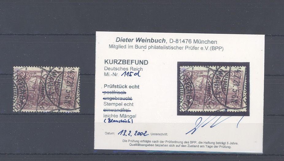Deutsches Reich Michel Nummer 115d, 2,50 Mark Freimarke 1920 in der Farbe d gestempelt mit einem leichten Blaustrich in der linken Ecke, sonst ein schöner Wert. Es liegt ein Befund BPP vor, hat bereits einiges gekostet, ist mit eingescannt.