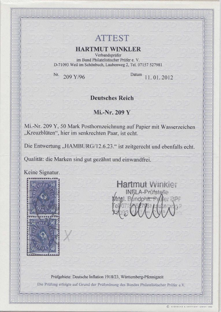 Deutsches Reich Mi.Nr. 209 Y, 50 Pfg. Wasserzeichen Y gestempelt,. Es liegt ein FA vom ehemaligen Paar BPP vor, hat bereits einiges gekostet, ist mit eingescannt.