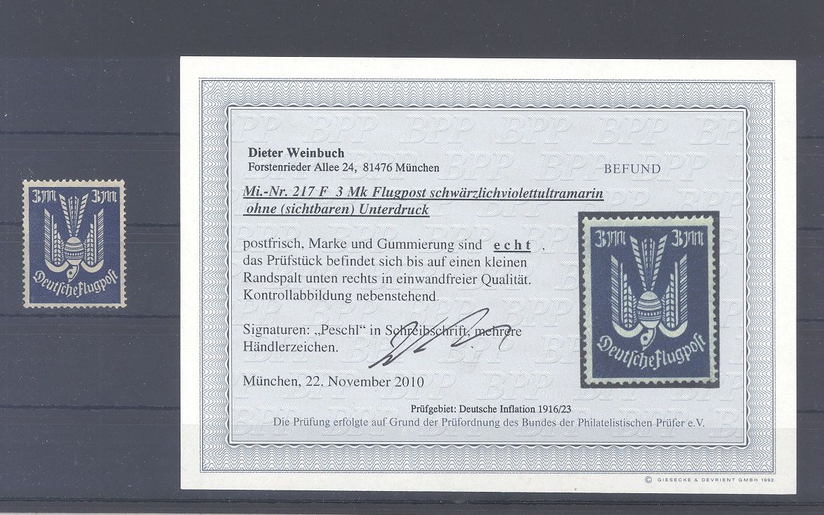 Deutsches Reich Michel Nummer 217 F, 3 Mark Freimarke 1922 ** mit einem kleinen Randspalt, sonst ein schöner Wert. Es liegt ein Befund BPP vor, ist mit eingescannt, hat bereits einiges gekostet.