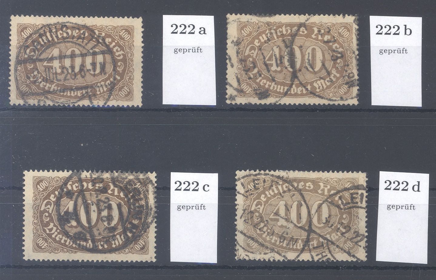 Deutsches Reich Michel Nummer 222a-d, die 400 Mark Freimarke 1922 in allen vier Farben gestempelt. Jeder Wert ist geprüft Infla, nett einmal so komplett.