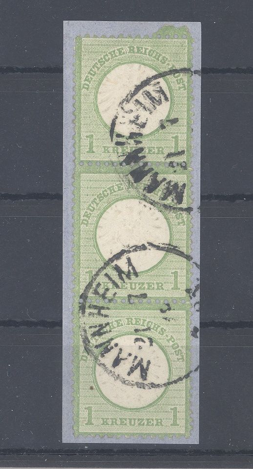 Deutsches Reich Michel Nummer 23, 1 Kreuzer großes Brustschild 1872 im farbfrischer Dreierstreifen auf kleinem Briefstück aus Mannheim. Nette Ergänzung zur Sammlung!