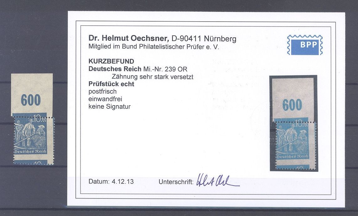 Deutsches Reich Mi.Nr. 239, 10 Mark Freimarke 1923 mit stark versetzter Zähnung. Es liegt ein Befund BPP vor, ist mit eingescannt, hat bereits einiges gekostet, nette Ergänzung zur Sammlung!