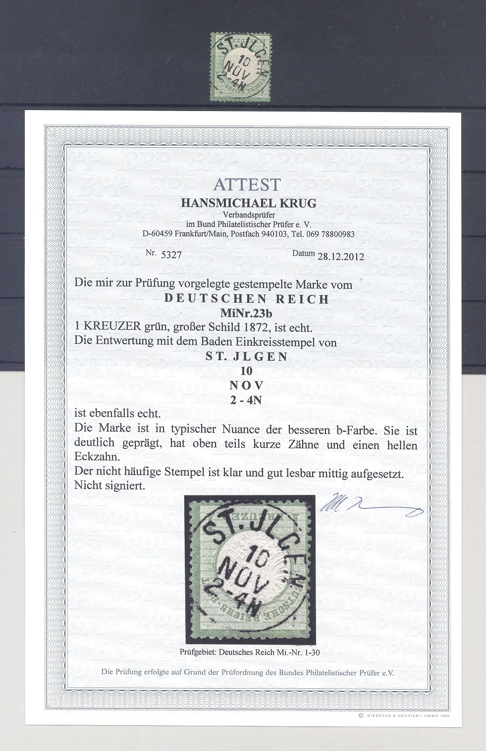 Deutsches Reich Michel Nummer 23b 1 Kreuzer Grosches Brustschild in der besseren Farbe b mit Qualitätseinschränkungen, aber sehr schönem und klarem und wie auch im FA erwähnt seltenem Stempel. Es liegt ein FA BBP vor, hat bereits einiges gekostet, ist mit eingescannt, der Michel ohne Stempelbewertung beträgt bereits 800,00 Euro.