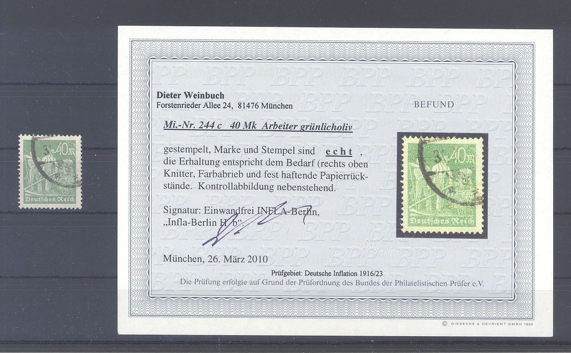 Deutsches Reich Michel Nummer 244c, 40 M. Freimarke 1922 in der guten Farbe c gestempelt in ordentlicher Bedarfserhaltung. Es liegt ein Befund BPP vor, hat bereits einiges gekostet, selten einmal angeboten.