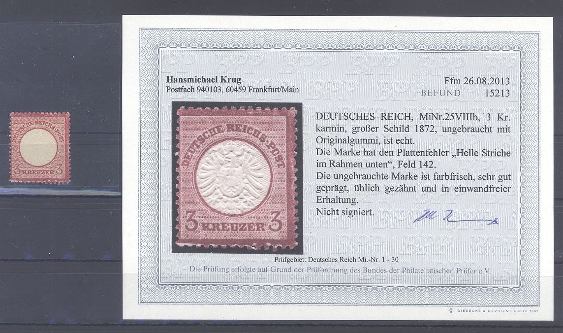 Deutsches Reich Michel Nummer 25 VIIIb, 3 Kreuzer großes Brustschild mit dem Plattenfehler VIIIb ungebraucht *, ein schöner Wert. Es liegt ein Befund BPP vor, ist mit eingescannt, hat bereits einiges gekostet.