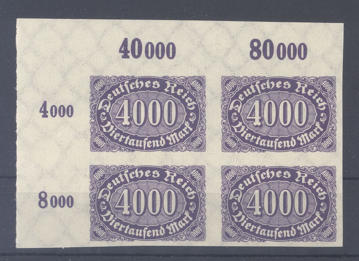 Deutsches Reich Mi.Nr. 255 U, die 4000 Mark Freimarke 1923 ungezähnt als ** Viererblock vom Eckrand. Nette Ergänzung zur Sammlung!