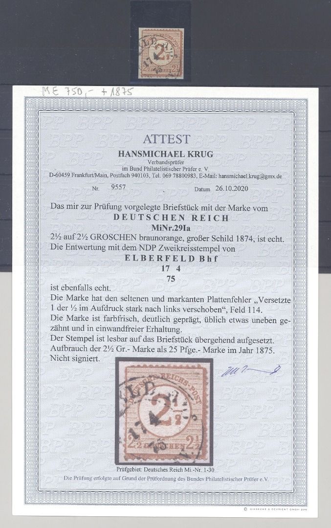 Deutsches Reich Michel Nummer 29 I a, 2 1/2 Gr. Freimarke 1874 mit dem auch im FA erwähnt seltenen Plattenfehler I a gestempelt in ordentlicher Bedarfserhaltung mit schönem Stempel auf kleinem Briefstück. Es liegt ein FA BPP vor, hat bereits einiges gekostet, ist mit eingescannt.