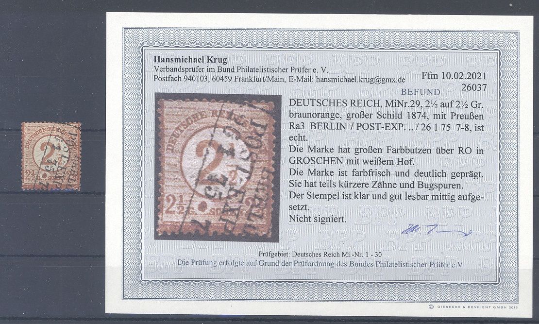 Deutsches Reich Michel Nummer 29, 2 1/2 Gr. Freimarke 1874 mit spannenderm, schon fast spektatulärer Besonderheit gestempelt. Es liegt ein Befund BPP vor, hat bereits einiges gekostet, ist mit eingescannt.