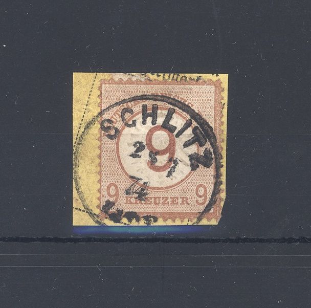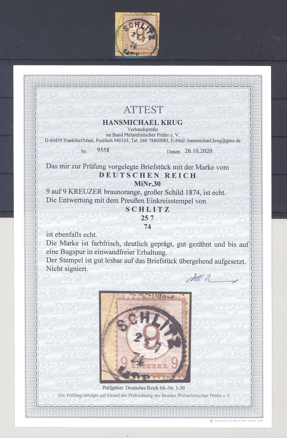 Deutsches Reich Michel Nummer 30, 9 Kreuzer Freimarke 1874 mit einer Bugspur, sonst ein schöner Wert gestempelt mit Preußen Stempel Schlitz.