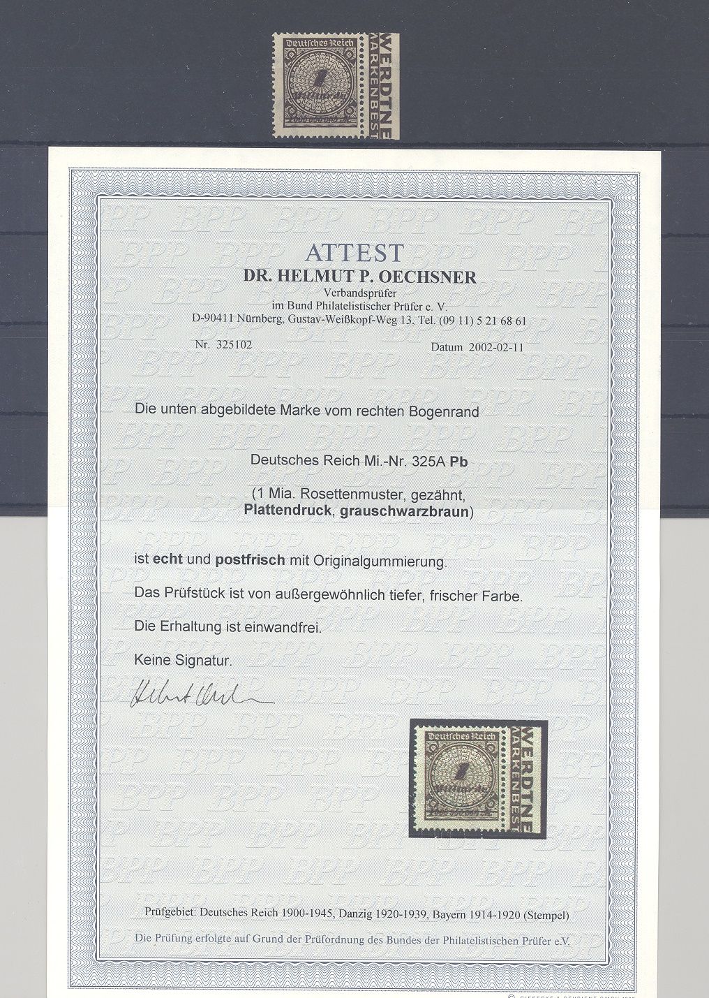 Deutsches Reich Michel Nummer 325 A Pb, 1 Mrd. Freimarke 1923 in der guten Farbe b ** vom Seitenrand, ein schöner Wert mit wie auch im FA BPP angegeben, von außergewöhnlich tiefer, frischer Farbe. Es liegt ein FA BPP vor, hat bereits einiges gekostet, ist mit eingescannt, in dieser Form selten einmal angeboten.