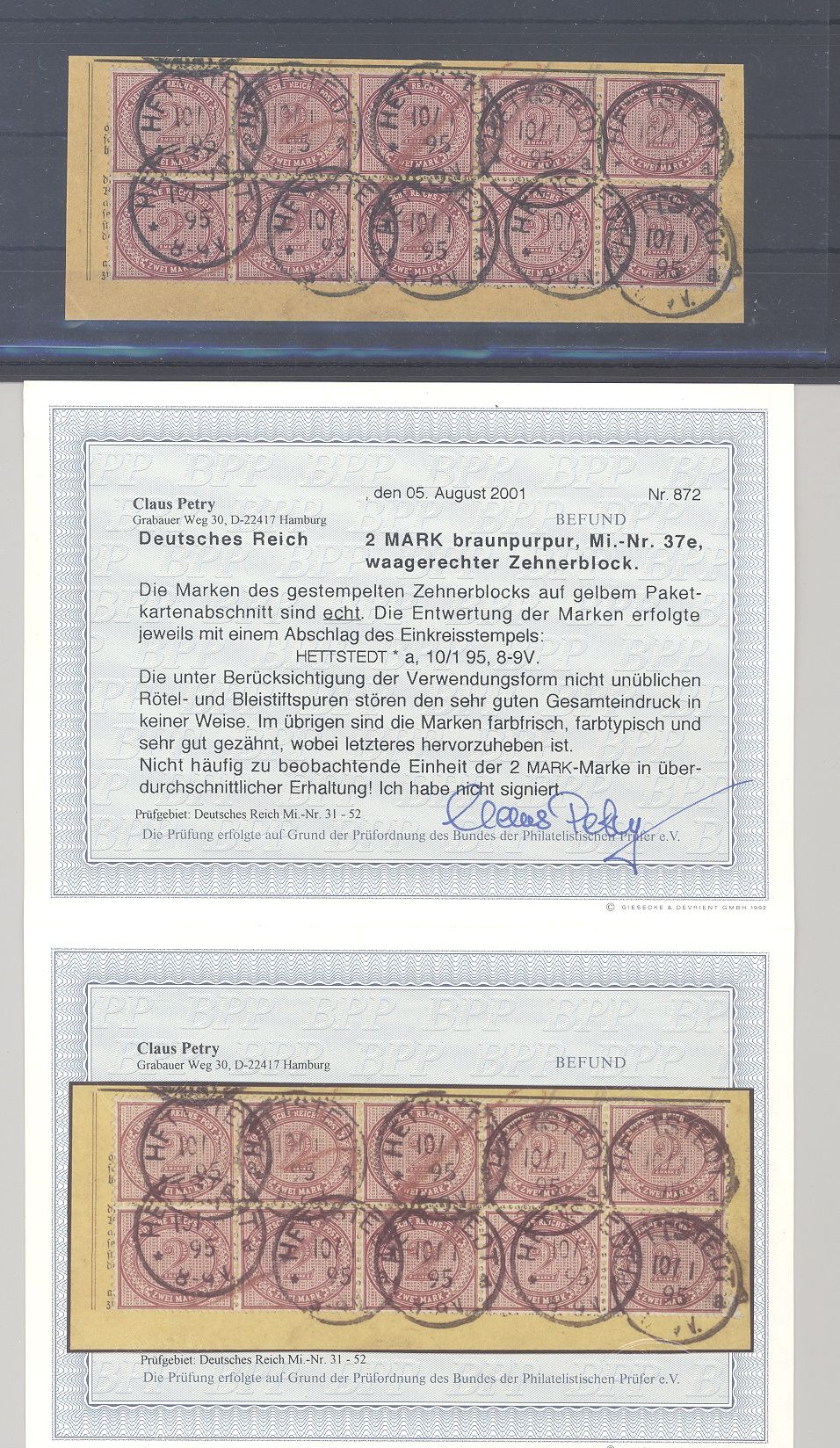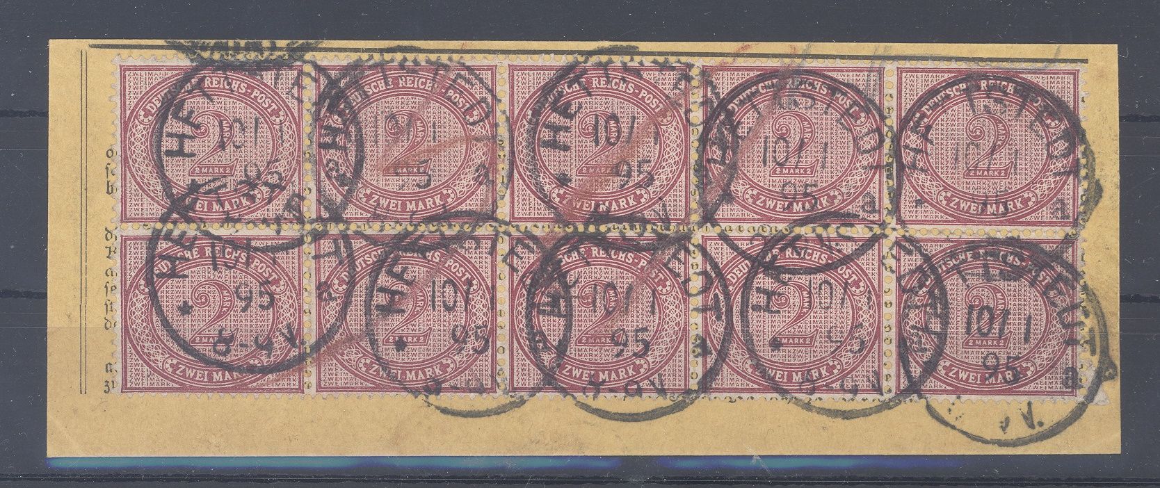 Deutsches Reich Michel Nummer 37e, 2 Mark Freimarke 1875 als traumhaft gestempelter Zehnerblock mit zudem hier außergewöhnlicher guter Zähnung. Es liegt ein FA BPP vor, hat bereits einiges gekostet, ist mit eingescannt, ein echter Hingucker und selten einmal angeboten!