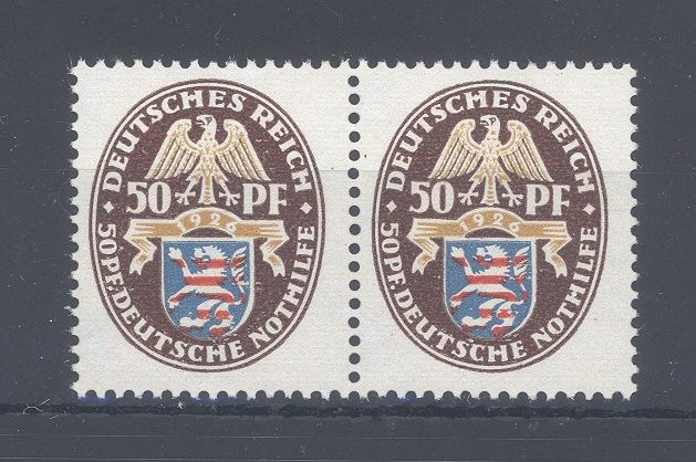 Deutsches Reich Michel Nummer 401y, 50 Pfg. Nothilfe 1926 in der Variante y im ** Paar mit leichtem Farbabklatsch rückseitig **, sonst ordentlich.