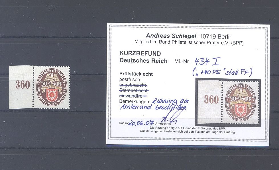 Deutsches Reich Michel Nummer 434 I, die 50 Pfg. Freimarke 1929 mit der Abart I **, die Zähnung ist am Unterrrand etwas beschnitten, sonst ordentlich. Es liegt ein Befund BPP vor, hat bereits einiges gekostet, ist mit eingescannt.