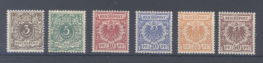 Deutsches Reich Michel Nummer 45/50 Adler / Krone 1889 **, drei Werte sind etwas stockig, sonst ein ordentlicher Satz. Drei Werte sind geprüft BPP, stets billigste Farben gerechnet.