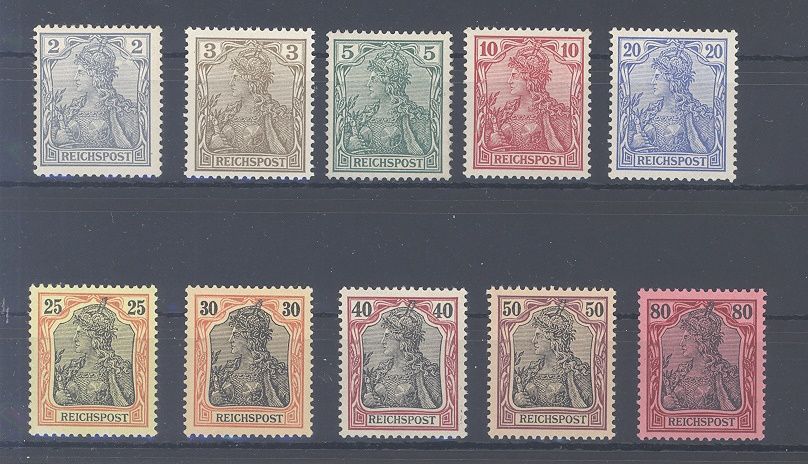 Deutsches Reich Michel Nummer 53/62, Reichspost 1900 ** in etwas unterschiedlicher, insgesamt aber doch ordentlicher Erhaltung. Drei Werte sind geprüft.