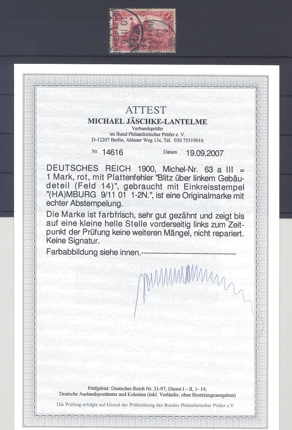Deutsches Reich Michel Nummer 63a II, 1 Marke 1900 mit dem Plattenfehler III gestempelt mit einer helleren Stelle, sonst in ordentlicher Bedarfserhaltung. Es liegt ein FA BBP vor, hat bereits einiges gekostet, ist mit eingescannt.