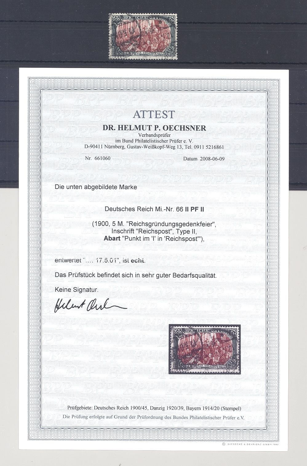 Deutsches Reich Michel Nummer 66 II , 5 Mark Reichspost 1900 mit dem Plattenfehler II gestempelt in sehr guter Bedarfserhaltung. Es liegt ein FA BBP vor, hat bereits einiges gekostet, ist mit eingescannt. Selten einmal angeboten!