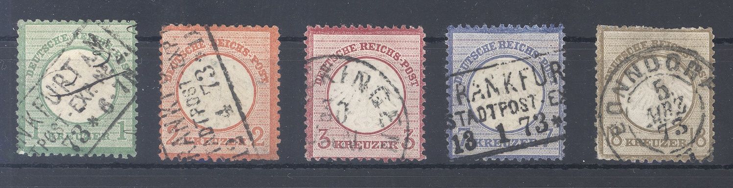 Deutsches Reich Michel Nummer 7/11, die Kreuzerausgaben Freimarken kleines Brustschild 1872 gestempelt in unterschiedlicher Erhaltung. Die Michel Nummer 9/11 sind geprüft.