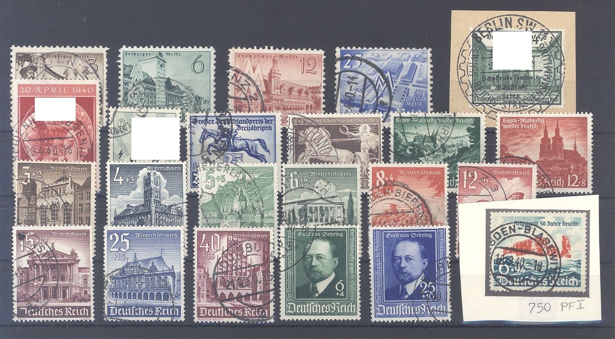 Deutsches Reich Michel Nummer 739/61, der Jahrgang 1940 gestempelt, dabei auch die Michel Nummer 750 mit dem Plattenfehler I, wertet bereits mit 180,00 Euro.
