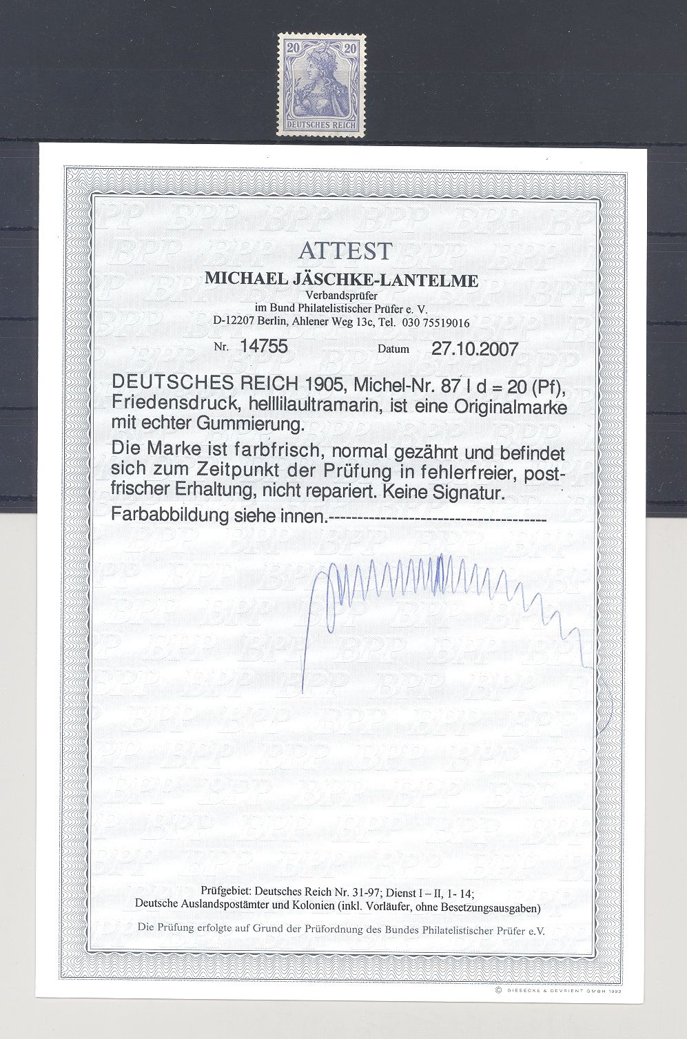 Deutsches Reich Michel Nummer 87 I d, 20 Pfg. Germania in der guten Farbe b **, ein schöner Wert. Es liegt ein FA BPP vor, hat bereits einiges gekostet, selten einmal angeboten.
