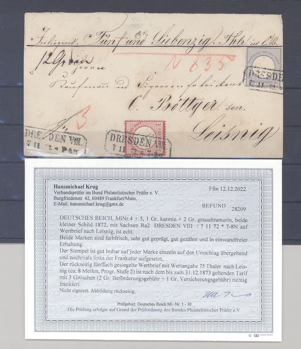 Deutsches Reich, dekorativer Wertbrief frankiert mit einer 1 + 2 Groschen Brustschild MiF aus Dresden gelaufen. Es liegt ein Befund BPP vor, hat bereits einiges gekostet, ist mit eingescannt.