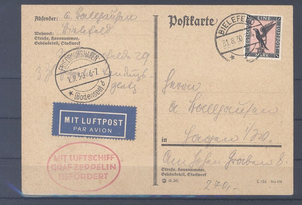 Deutsches Reich, saubere Zeppelinkarte mit 1 Mark Flugpost als EF aus Bielefeld. Sehr schöne Ergänzung zur Sammlung!