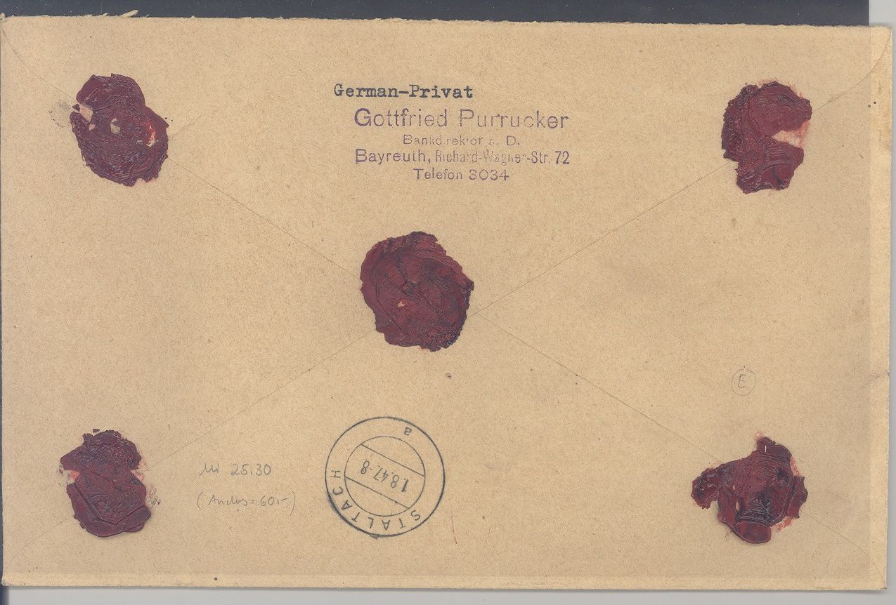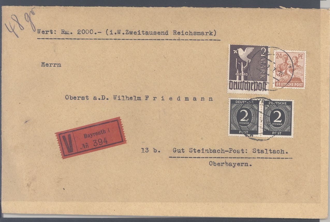 Alliierte Besetzung, interessanter Wertbrief vom 1.8.1947 frankiert mit 2 DM Friedenstaube MiF aus Bayreuth gelaufen.
