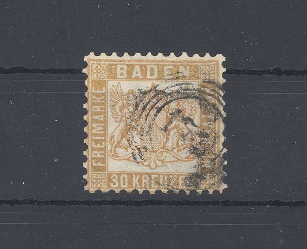 Baden Michel Nummer 22b, 30 Kreuzer Freimarken 1862 gestempelt, ausgebessert, optisch ein ordentlicher Wert. Der Wert ist geprüft mit Altprüfung.