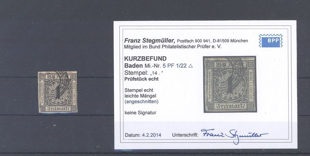Baden Michel Nummer 5 PF 1/22, 1 Kreuzer 1853 mit dem Plattenfehler 1/22 gestempelt, etwas angeschnitten, sonst ein ordentlicher Wert. Es liegt ein Befund BPP vor, hat bereits einiges gekostet, ist mit eingescannt.