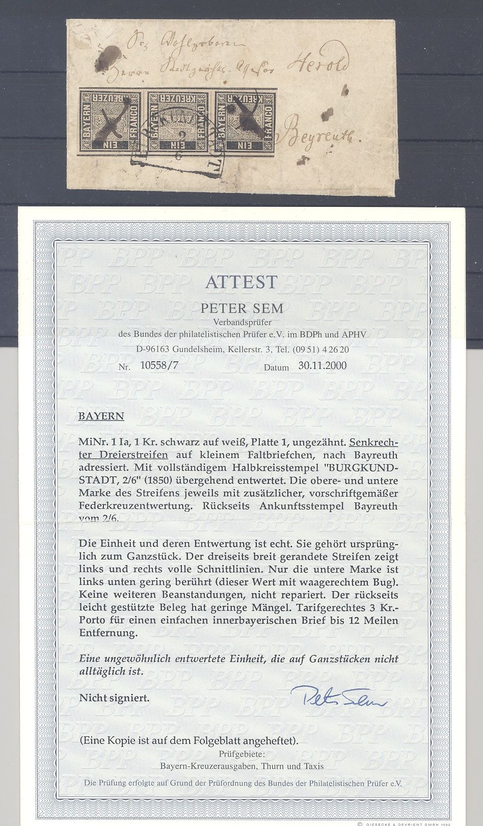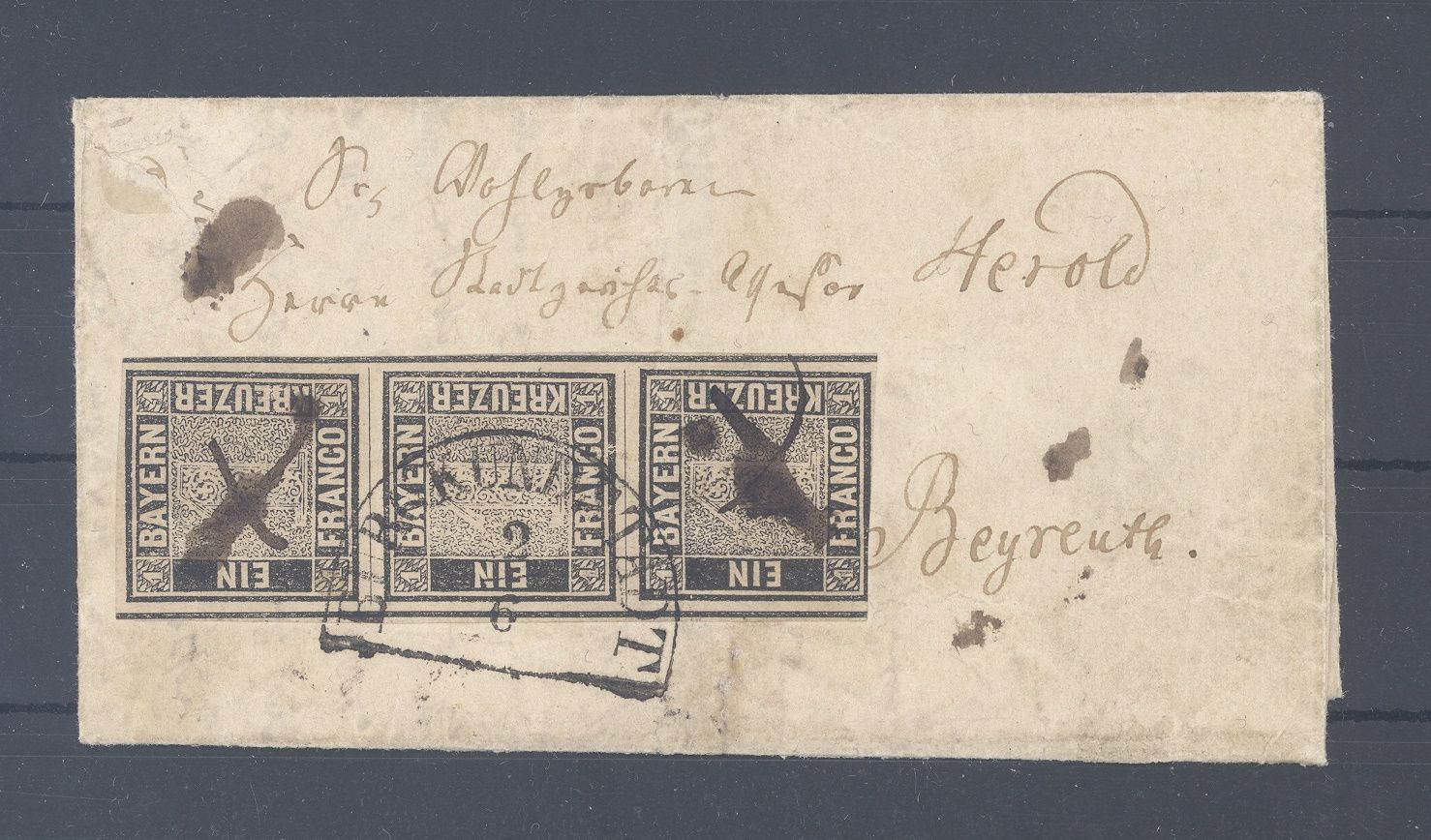 Bayern, sensationeller Brief frankiert mit einem Dreierstreifen der Michel Nummer 1 I a, 1 Kreuzer Freimarke 1849 mit Ortsstempel und Federzugentwertung. Es liegt ein FA BPP vor, hat bereits einiges gekostet, ist mit eingescannt, Highlight für die ganz große Altdeutschland Sammlung!