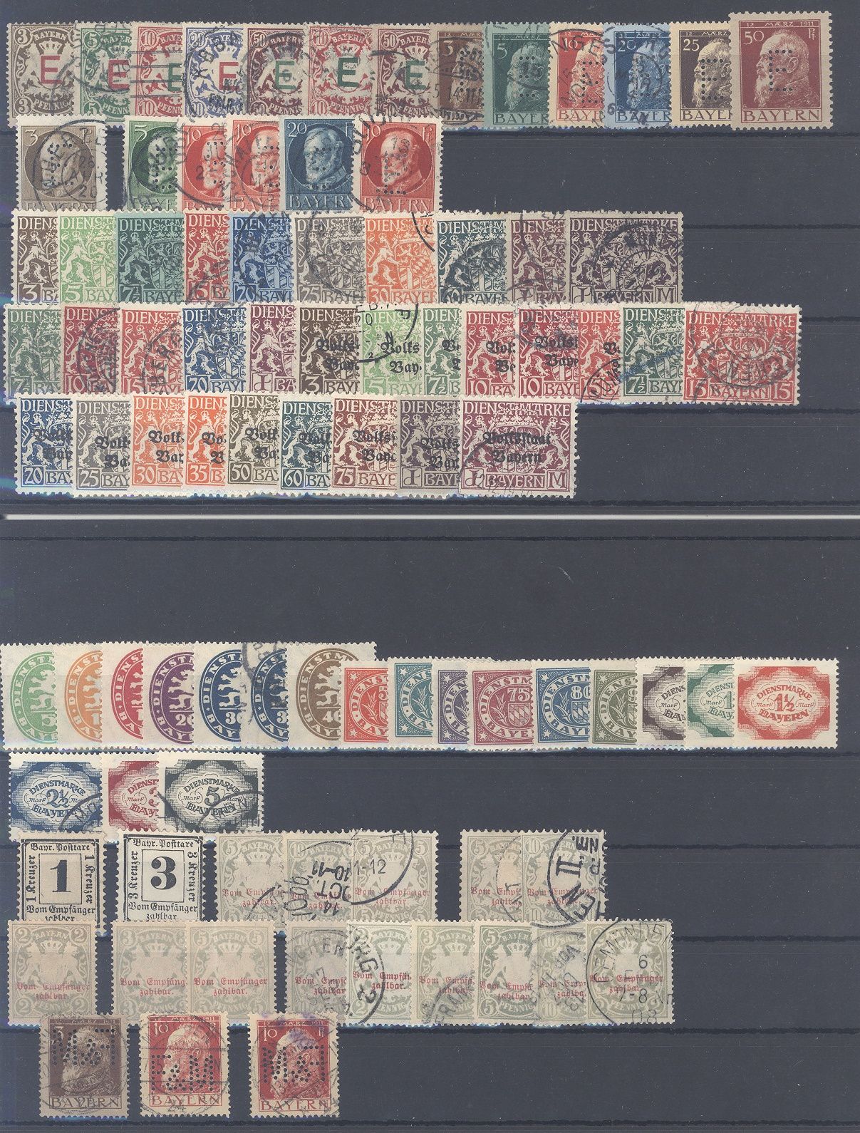 Bayern Dienst und Porto, umfangreicher Posten mit auch Michel Nummer Dienst 12/15 auf zwei Steckkarte, einfach zusammengesteckt. Vollkommen unberechnet, sollte bereits aufgrund der Materialfülle ein Schnäppchen sein du könntr auch eine Fundgrube hinsichtlich Typen und Varianten sein...