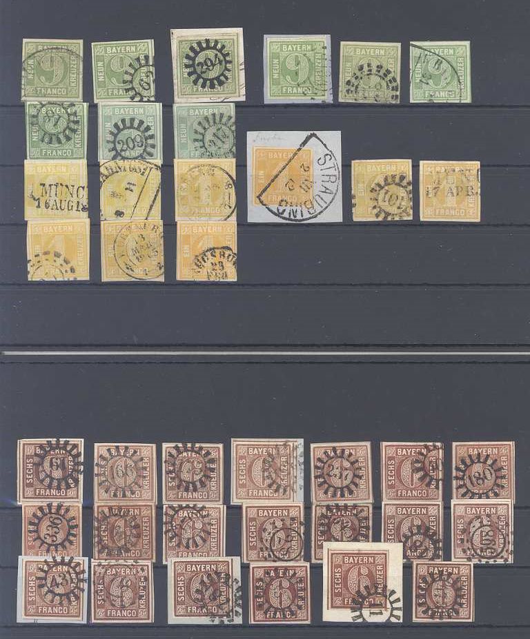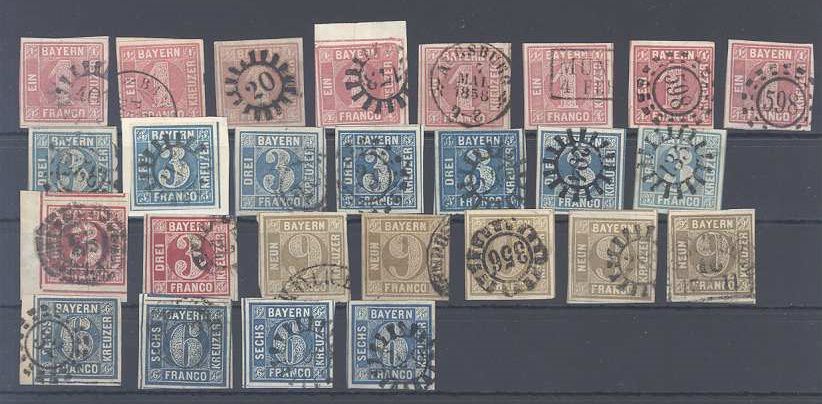 Bayern, gestempelter Posten ab Kreuzerausgaben auf drei Steckkarten, einfach zusammengesteckt, stammt aus einer alten Sammlung .Dabei schon auf dem ersten Blick verschiedene Farben und Typen, wunderbare Stempel,. die billigsten Typen und Farben werten bereits mit über 1.000,00 Euro, sollte ein nettes Schnäppchen sein!