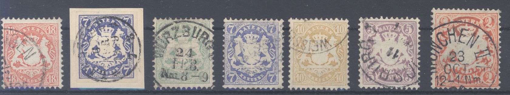 Bayern, netter gestempelter Posten besserer Wappenausgaben bestehend aus Michel Nummer 21b, 22Xc, 25 Xa, 29 Yb, 36,38b und 45b. Jeder Wert ist geprüft.